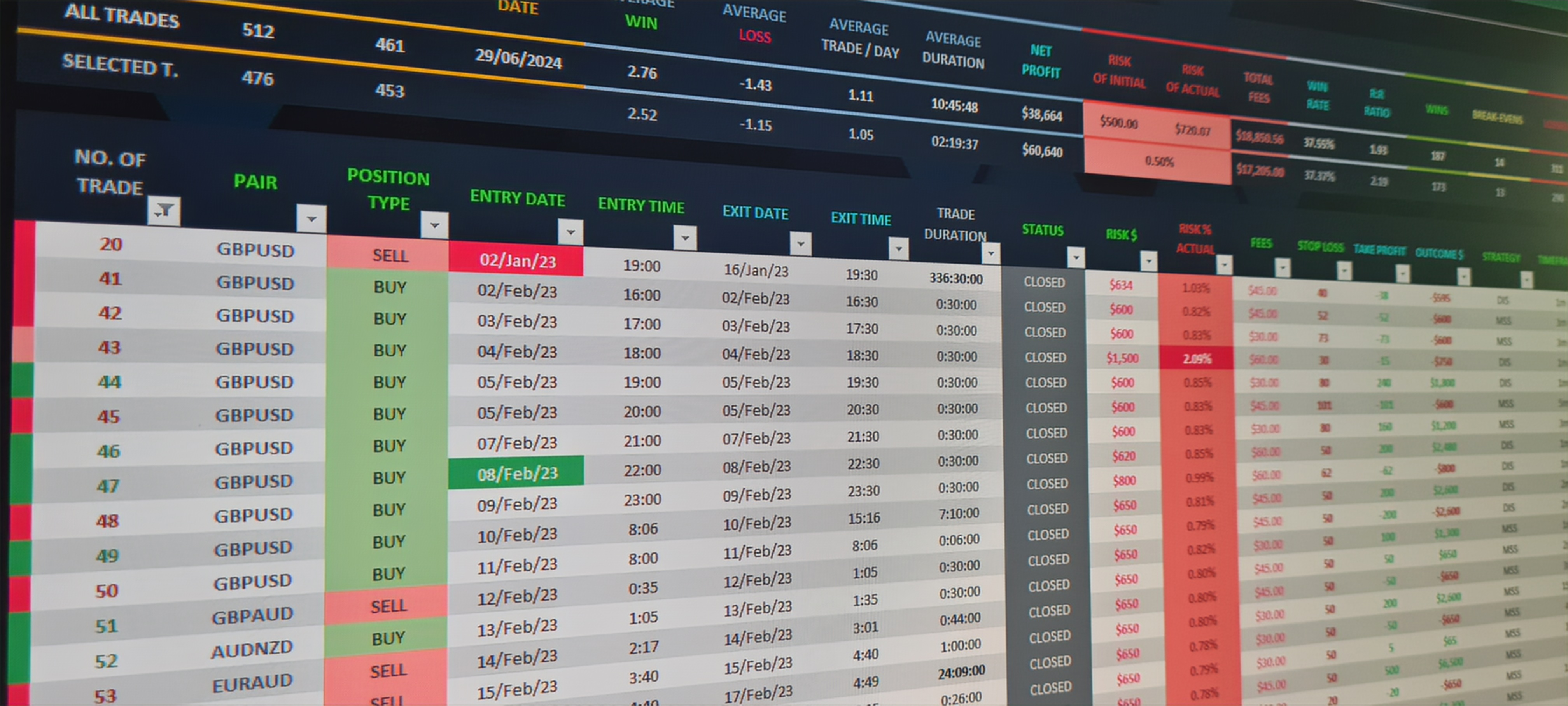 The intuitive layout of the journal allows for effortless tracking and analysis of your trades. The strategic use of colors provides immediate insights into the outcomes and actions taken, making it easy to evaluate your performance.
