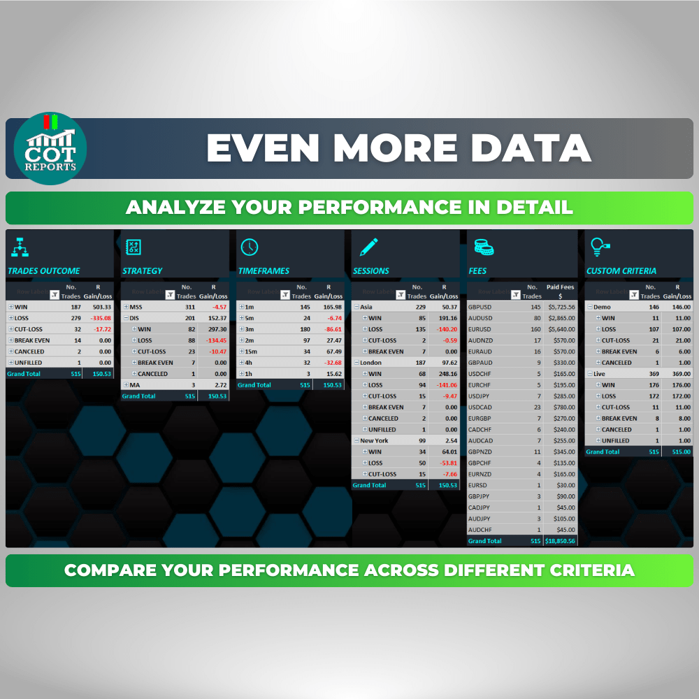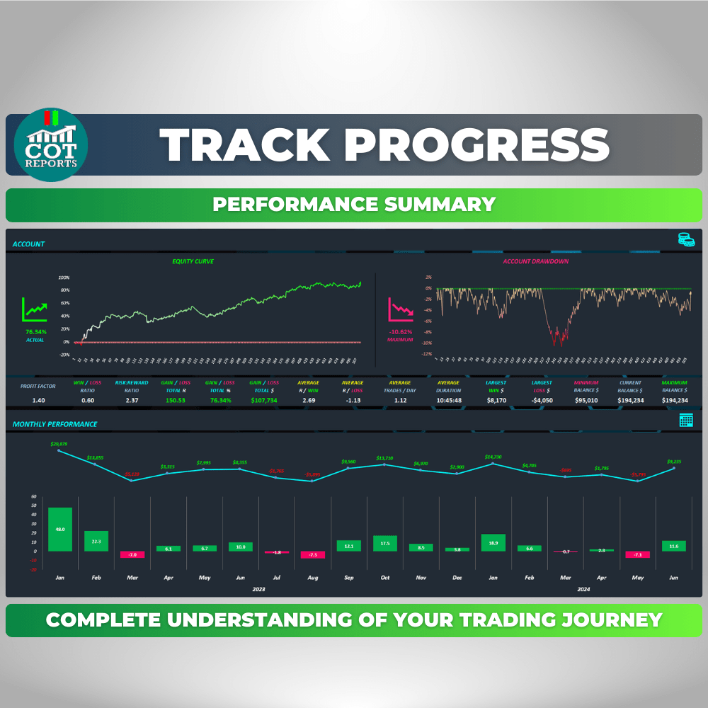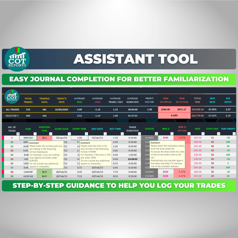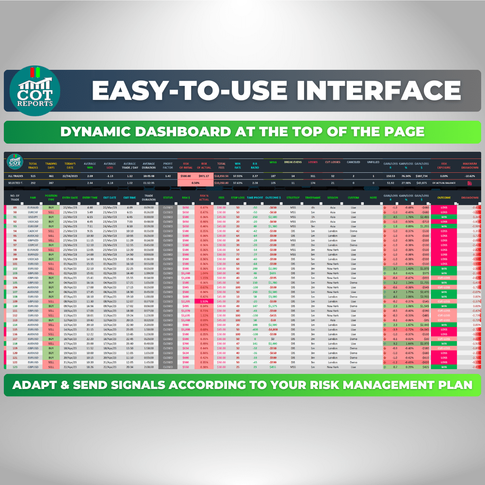 Whether you’re a complete beginner or an advanced trader, the COT-Reports Trading Journal spreadsheet is designed to help you take your trading to the next level. For beginners, it’s an excellent way to get started on the right foot by providing a detailed analysis of your trading history and identifying patterns and areas for improvement. It’s packed with features that make it easy to track your performance, analyze your trades, and more.