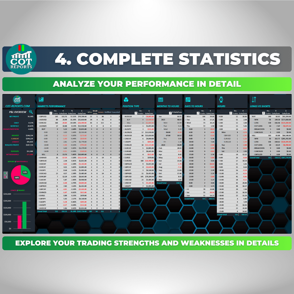 - COMPLETE STATISTICS: The second sheet is Complete Statistics, providing a numerical overview of your trading performance. It utilizes pivot tables to present data on individual strategies, markets, position types, days, hours, and outcomes. This sheet offers a detailed analysis of your trading activity and allows for tracking based on custom criteria.