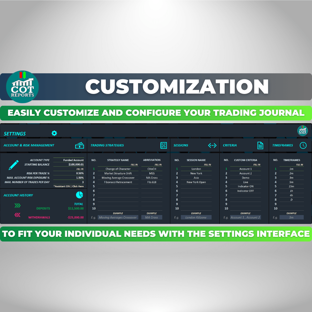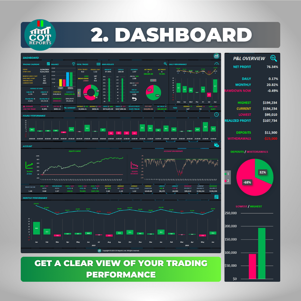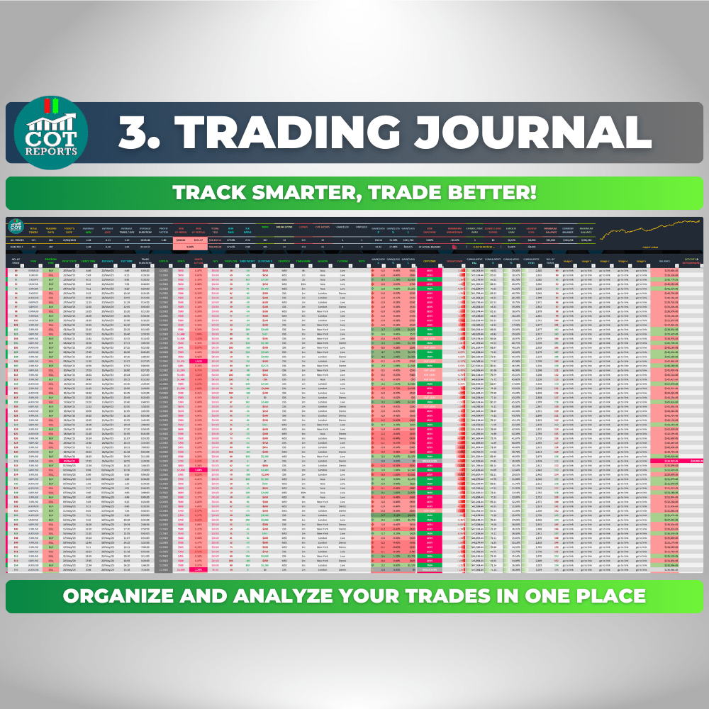 The COT Reports Trading Journal Spreadsheet is a must-have tool for traders looking to track and analyze their performance effectively. With its user-friendly interface and powerful features, this journal enhances your trading style and strategies.